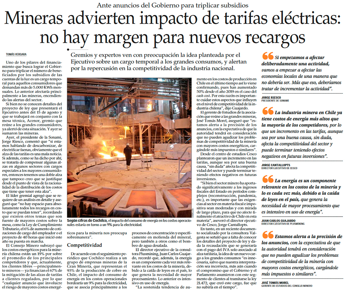 Sonami advierte fuerte impacto en la minería por alza en cuentas de la luz y alerta que algunas faenas ya operan en el margen - (DF Online)
