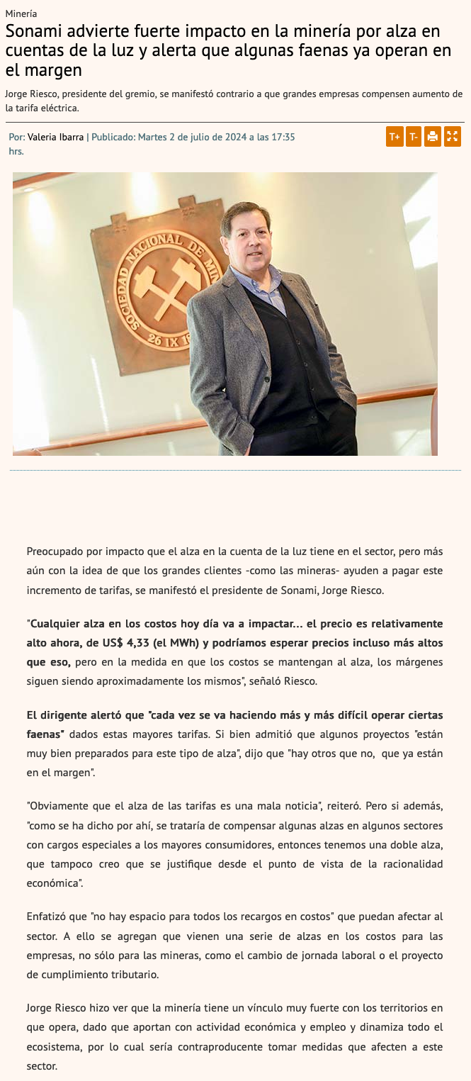 Mineras advierten impacto de tarifas eléctricas: no hay margen para nuevos recargos - (El Mercurio de Santiago)
