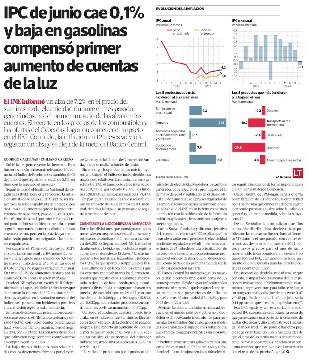 Pese a negativo IPC en junio, inflación sería de hasta 0,7% este mes por tarifas de la luz - (El Mercurio de Santiago)