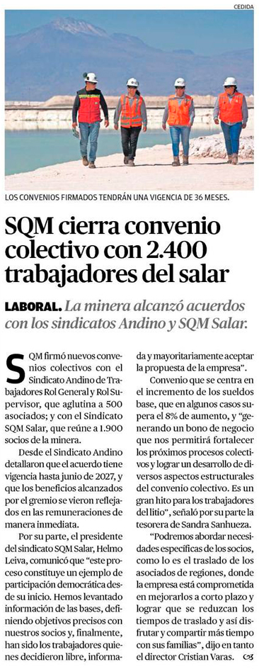 SQM cierra negociación con sindicato con beneficios por $14 millones - (El Mercurio de Santiago)