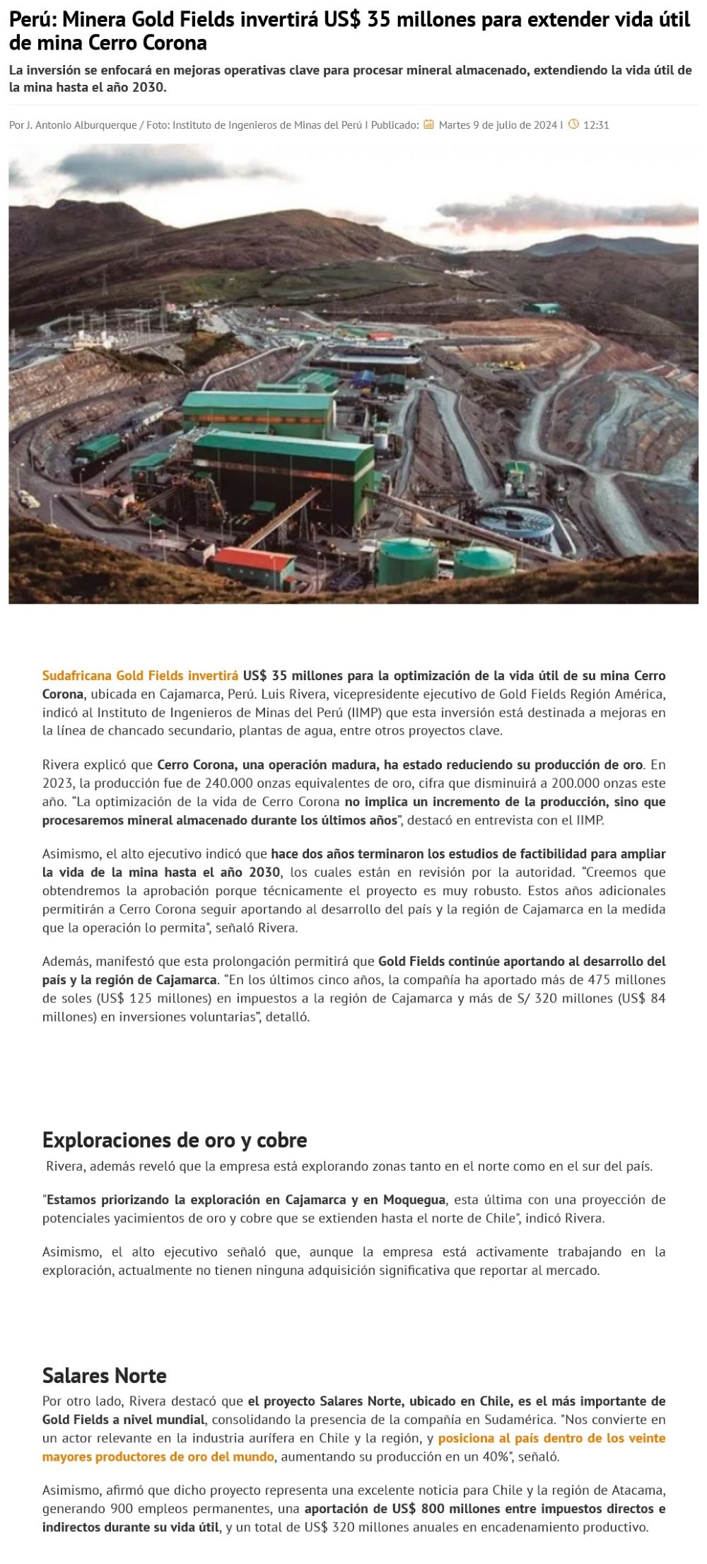 Perú: Gold Fields invertirá US$ 35 millones para extender vida útil de mina Cerro Corona - (Diario Financiero)