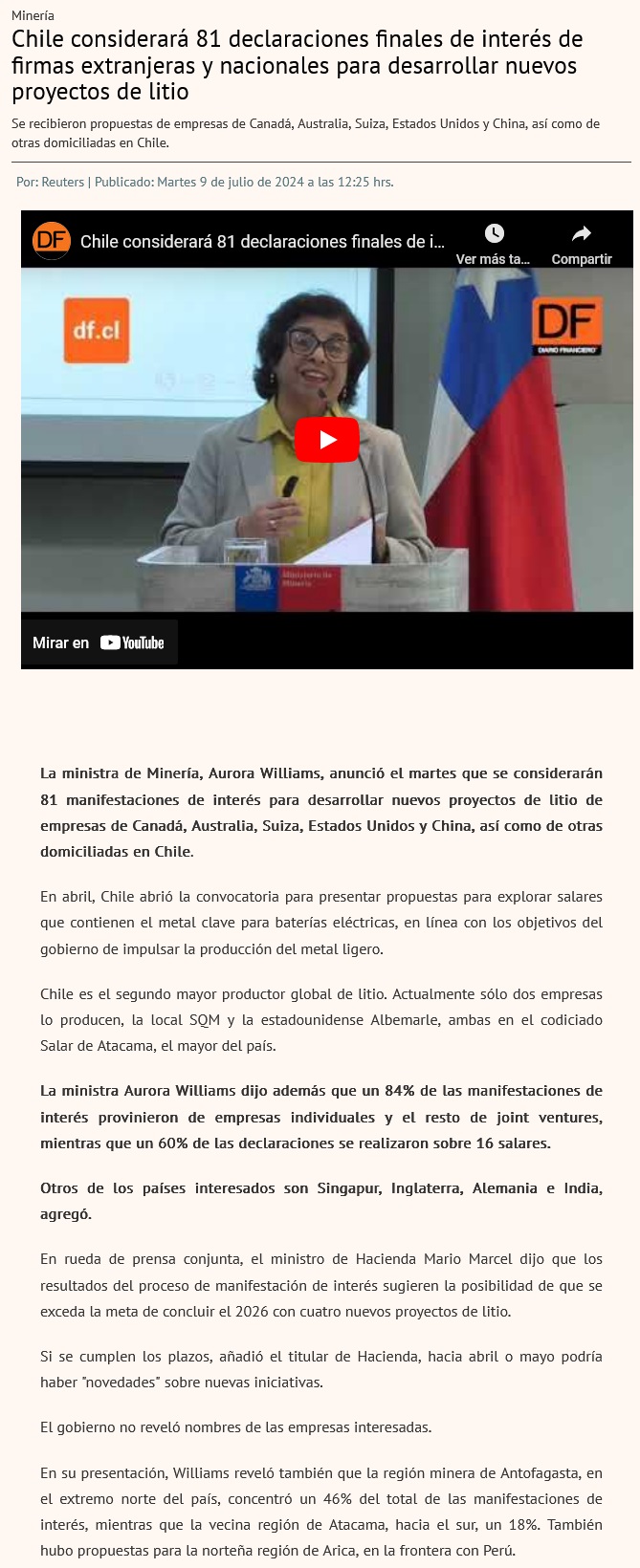 Presentan 40 manifestaciones de interés para proyectos de litio en 17 salares y yacimientos - (El Mercurio de Antofagasta)