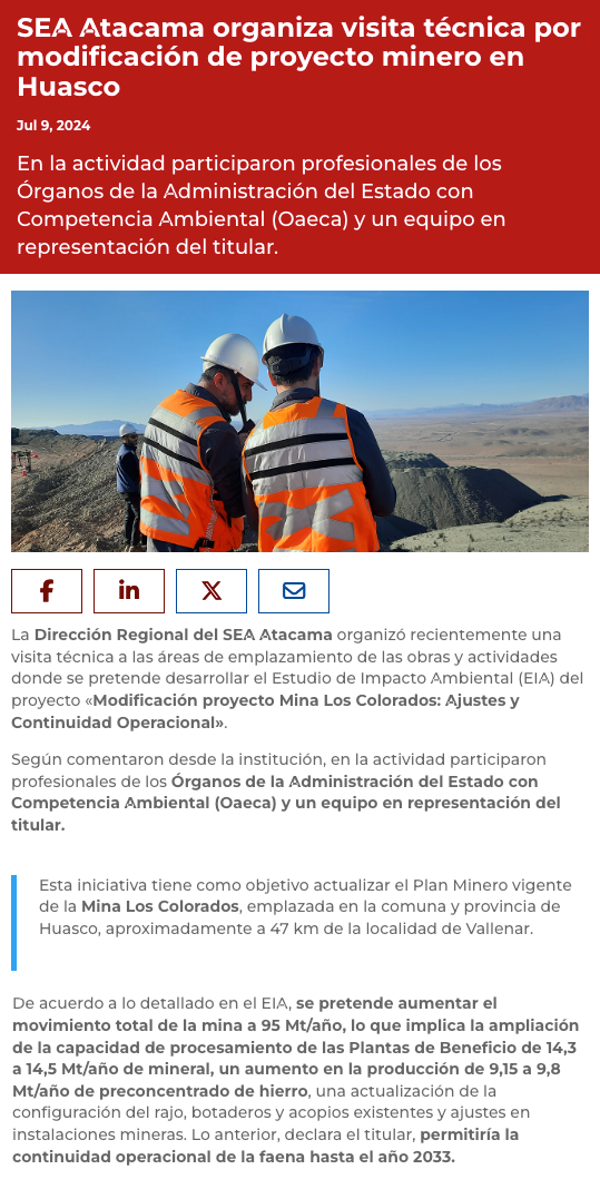 Dirección Regional del SEA Atacama realiza visita técnica para evaluar Modificación del Proyecto Mina Los Colorados - (madero.cl)