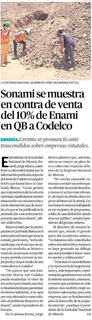 Sonami se opone a que Enami venda 10% de Quebrada Blanca a Codelco y pide una licitación - (Diario Financiero)