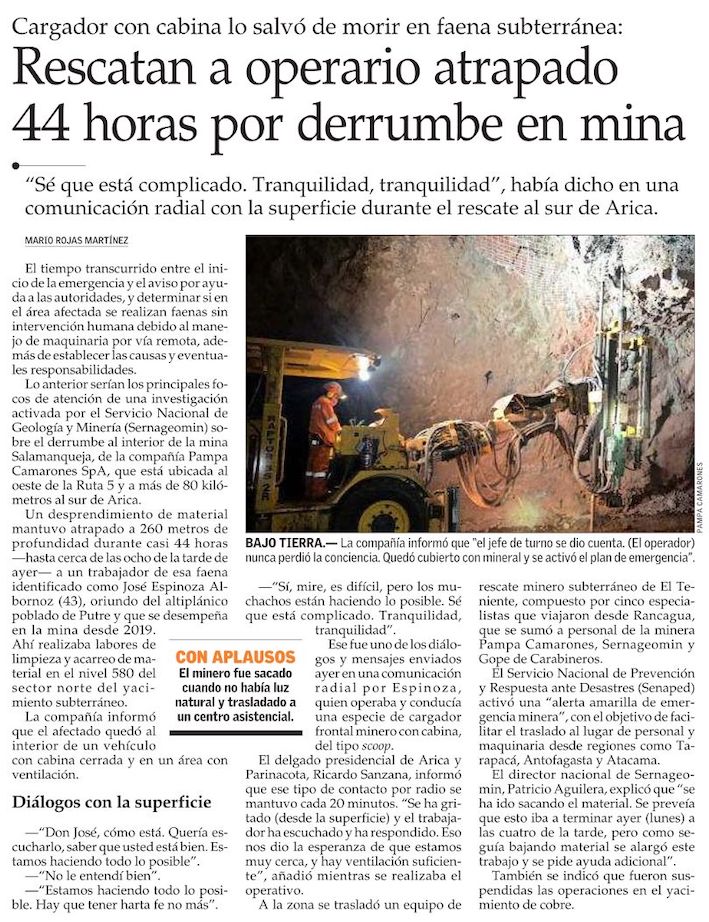 Minero fue rescatado tras casi dos días atrapado a 260 metros de profundidad - (cooperativa online)