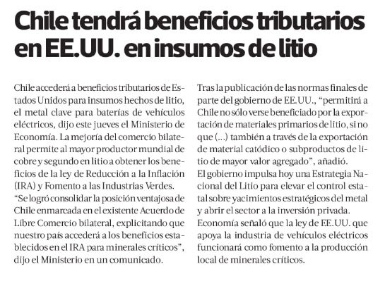Chile accederá a beneficios tributarios de EEUU para insumos hechos con litio - (Diario Financiero)