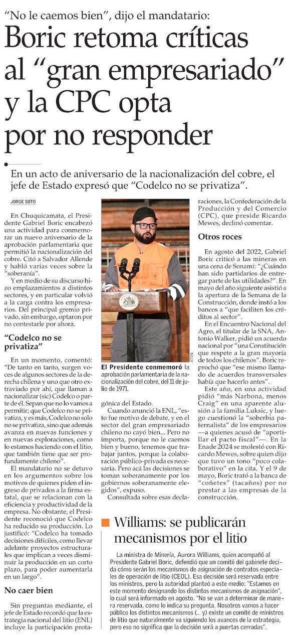 Boric conmemora la nacionalización y advierte que no permitirán la privatización de Codelco - (El Mercurio de Antofagasta)