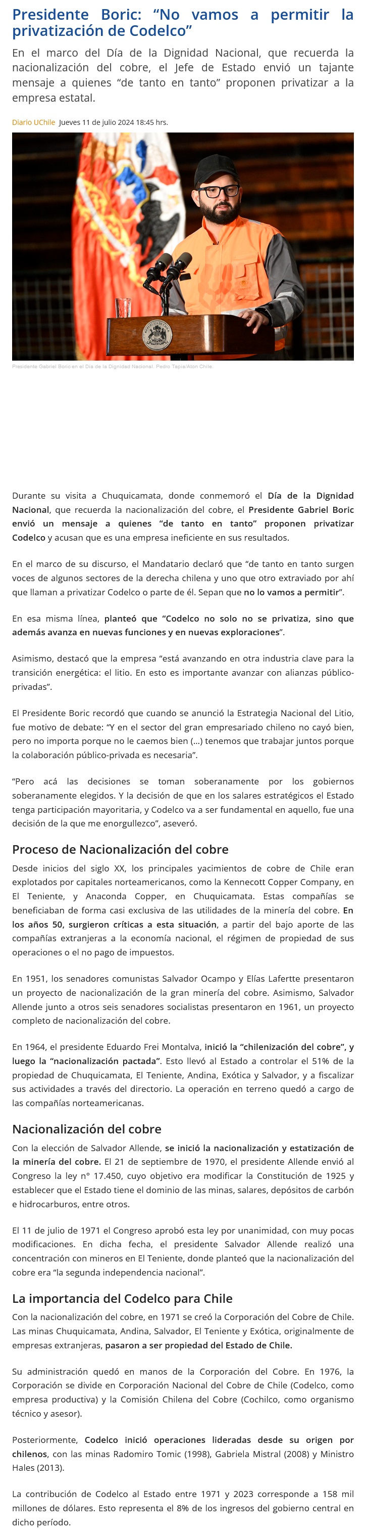 Boric conmemora la nacionalización y advierte que no permitirán la privatización de Codelco - (El Mercurio de Antofagasta)