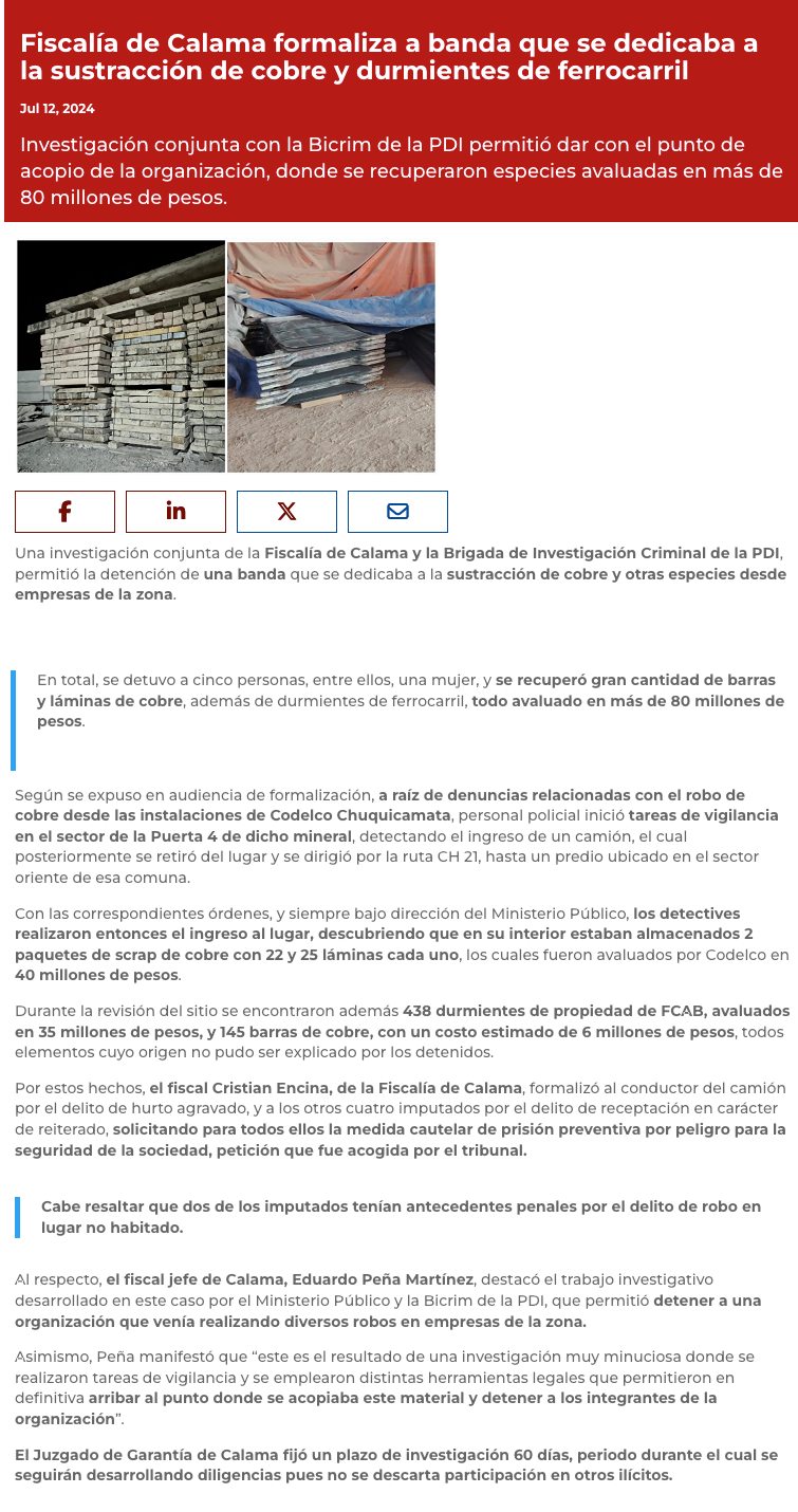 Fiscalía formalizó a banda dedicada al robo de cobre y durmientes - (El Mercurio de Antofagasta)