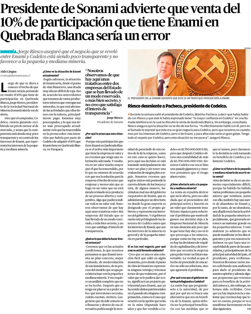 “Cada vez que Codelco ha tenido alguna intervención, Enami sale más perjudicada” - (El Mercurio de Santiago)