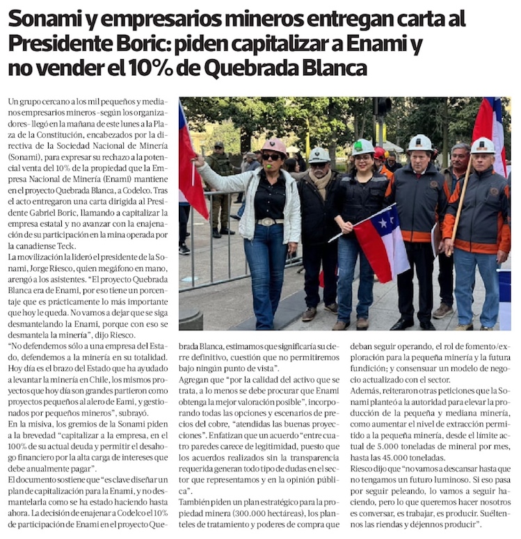 Sonami lleva a la CPC el conflicto por la venta de 10% de Quebrada Blanca de Enami a Codelco - (Diario Financiero)
