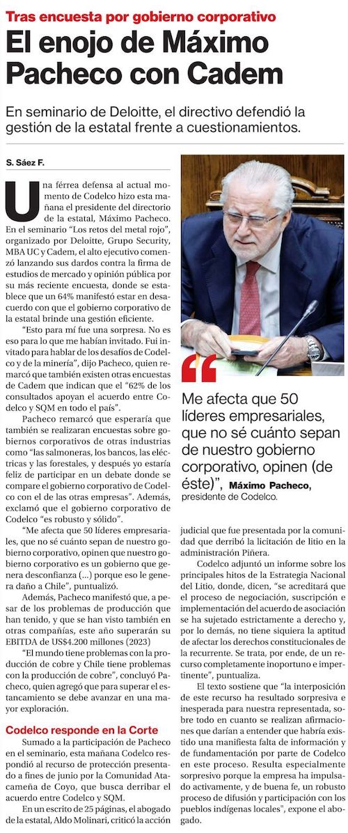 Máximo Pacheco refuta resultados de encuesta Cadem que cuestiona gobierno corporativo de Codelco - (Pulso)