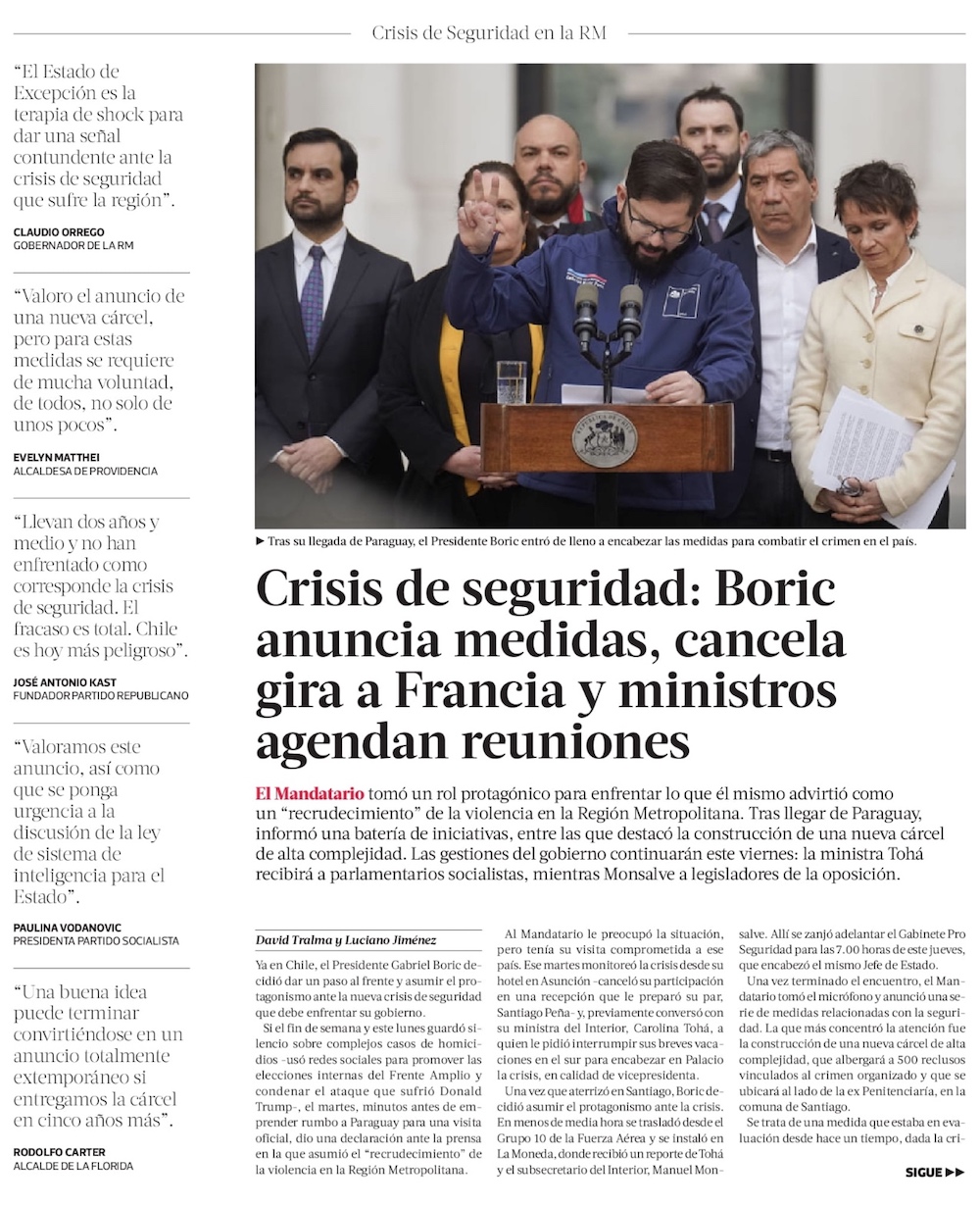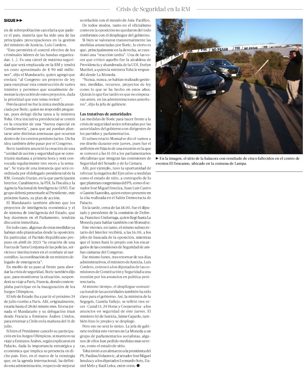 Crisis de seguridad obliga a Boric a reforzar plan carcelario que anunció en la Cuenta Pública - (El Mercurio de Santiago)