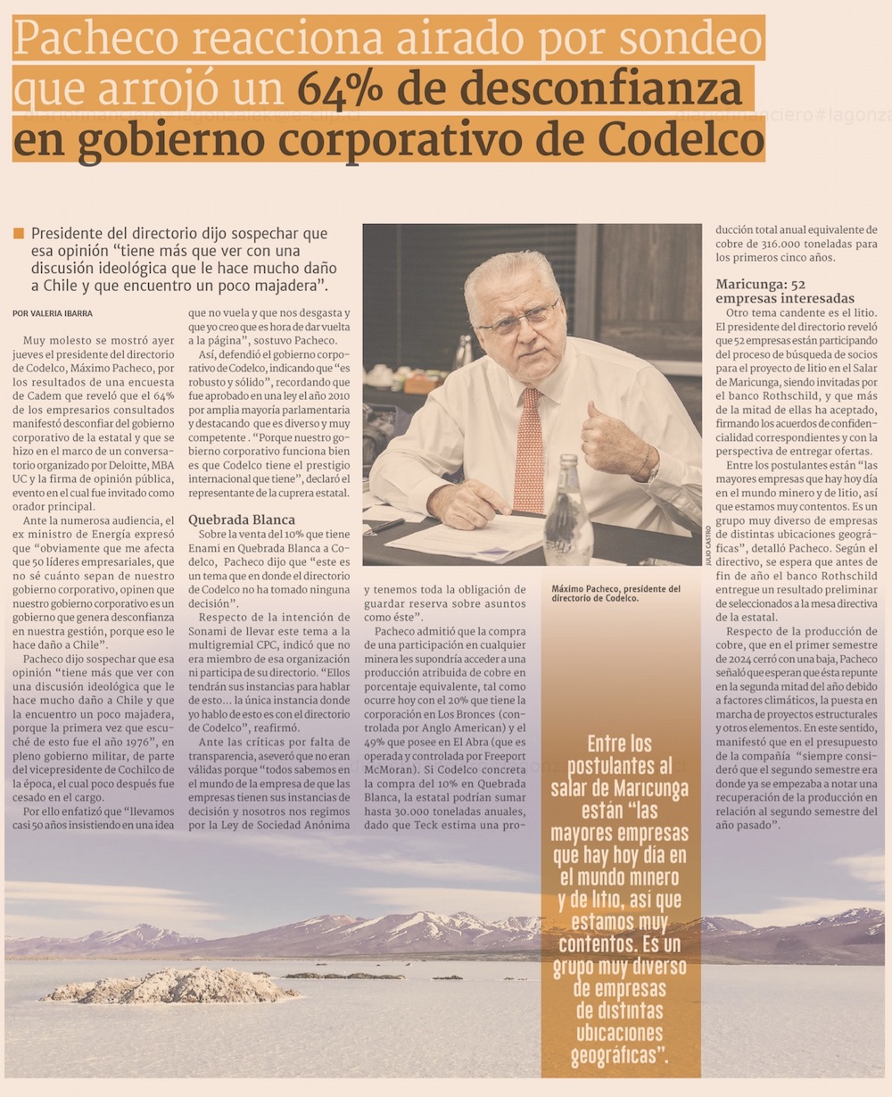 Máximo Pacheco refuta resultados de encuesta Cadem que cuestiona gobierno corporativo de Codelco - (Pulso)