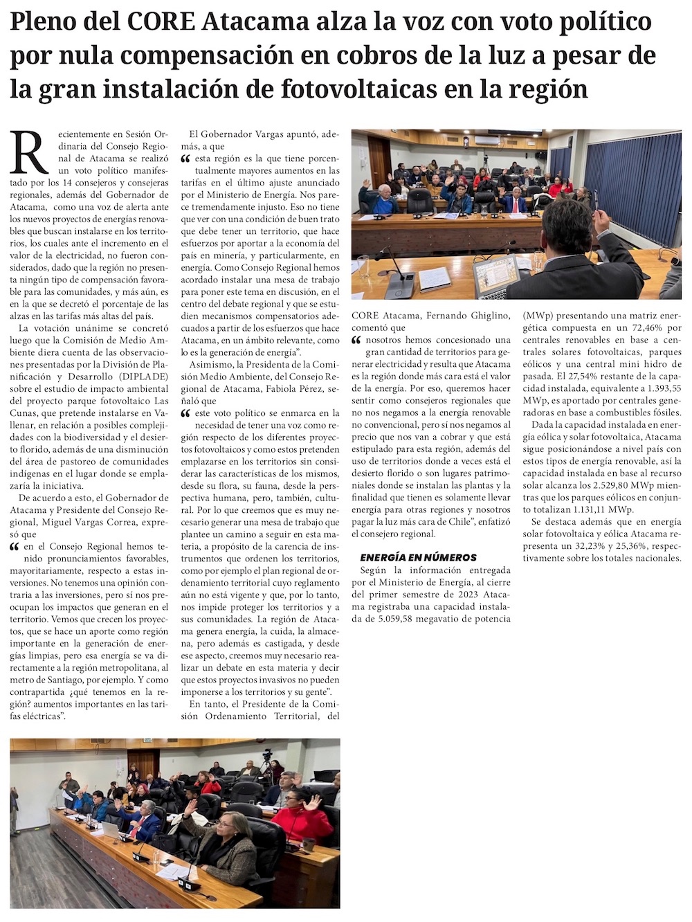Tras votación de proyecto fotovoltaico, CORE advierte por "trato" a la región - (El Diario de Atacama)