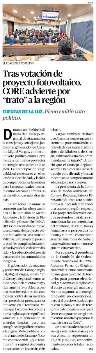 Pleno del CORE Atacama alza la voz con voto político por nula compensación en cobros de la luz a pesar de la gran instalación de fotovoltaicas en la región - (El Chañarcillo)
