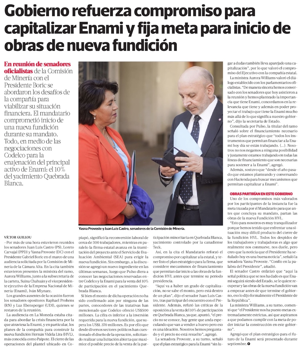 Gobierno dejaría en marcha obras de nueva fundición de Enami - (El Mercurio de Santiago)