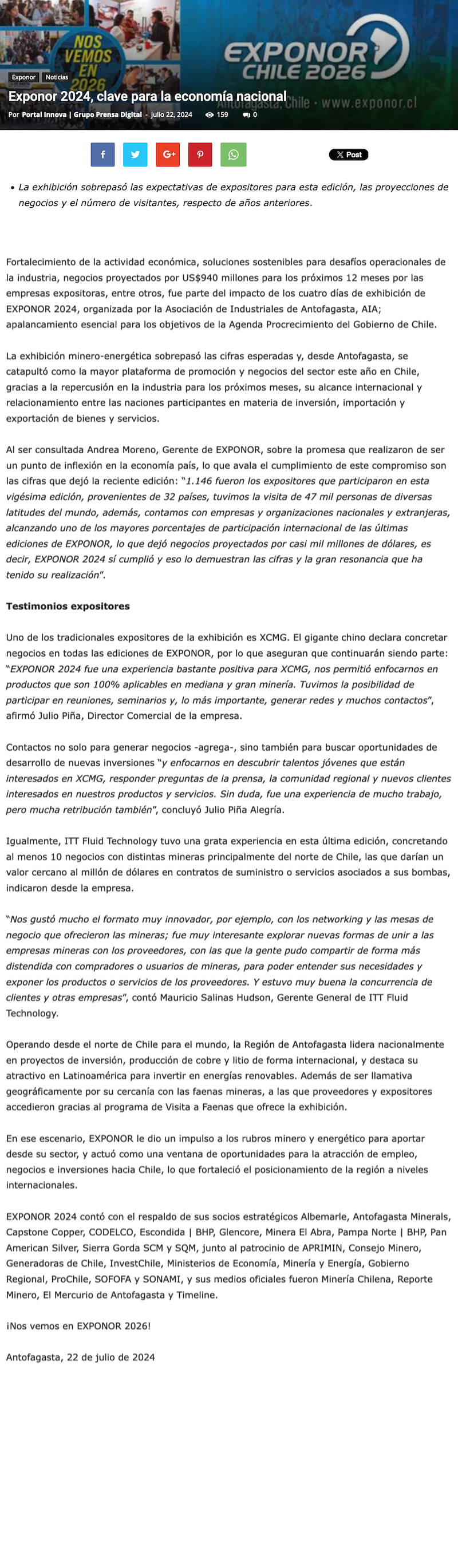 Clave para la economía nacional: Negocios proyectados por US$940 millones fue el impacto de Exponor 2024 - (reporteminero)