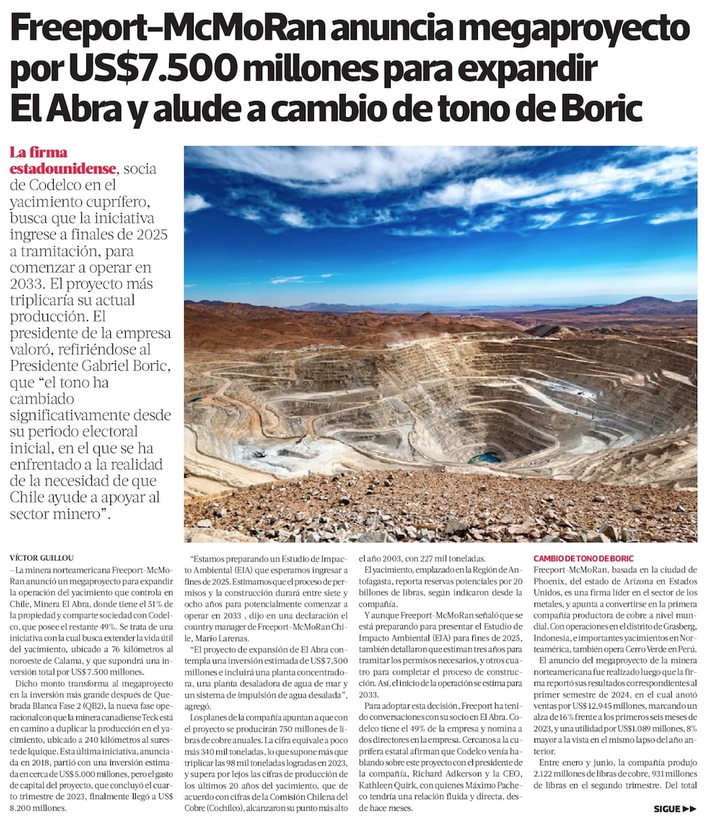 Freeport McMoran anuncia plan de US$ 7.500 millones para expansión de El Abra y será el segundo mayor proyecto minero del país - (Diario Financiero)