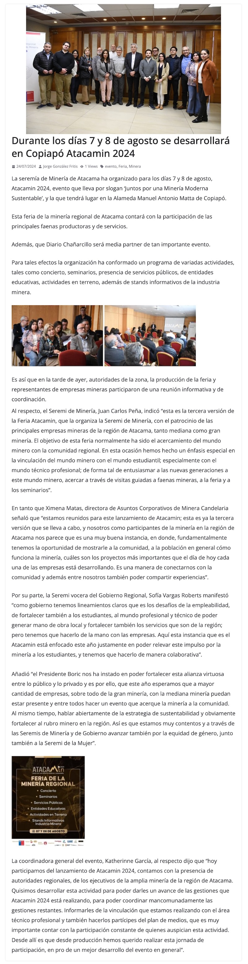 Durante los días 7 y 8 de agosto se desarrollará en Copiapó Atacamin 2024 - (El Chañarcillo)