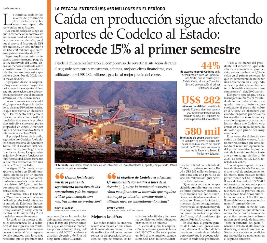 Codelco mejora sus resultados pese a descenso de 8,4% de su producción - (El Mercurio de Calama)