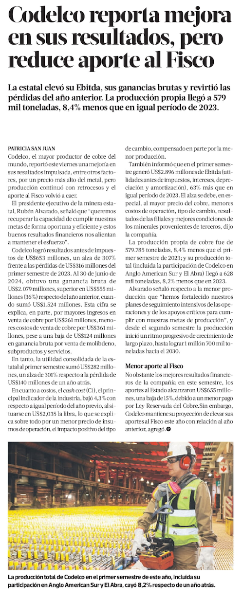 Codelco revierte pérdidas y gana US$ 282 millones al primer semestre - (Diario Financiero)