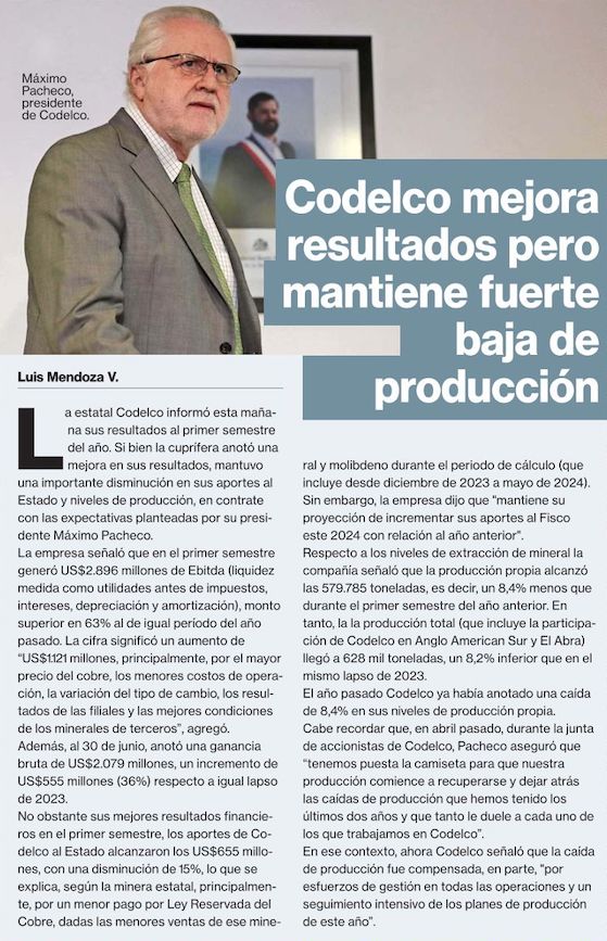 Caída en producción sigue afectando aportes de Codelco al Estado: retrocede 15% al primer semestre - (El Mercurio de Santiago)