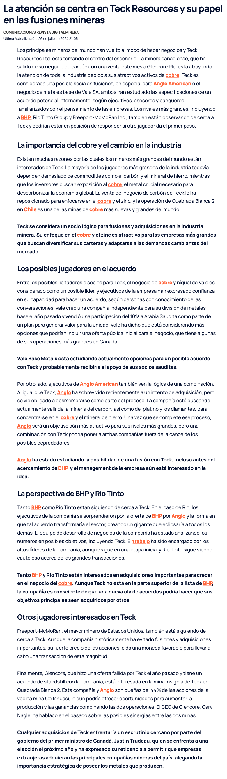 Teck atrae la atención de grandes mineras - (El Mercurio de Santiago)
