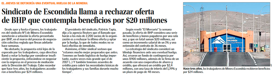 Trabajadores de Escondida votan última oferta de la empresa: bonos de $20 millones y reajuste de 1% - (Diario Financiero)