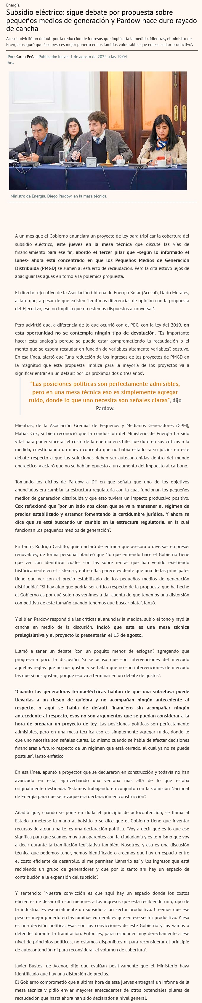 Subsidio eléctrico: sigue debate sobre pequeños medios de generación y Pardow hace duro rayado de cancha - (Diario Financiero)