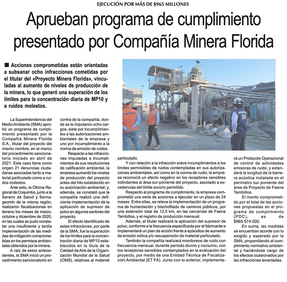 Ejecución por más de $965 millones: SMA aprueba programa de cumplimiento a Minera Florida - (reporteminero)