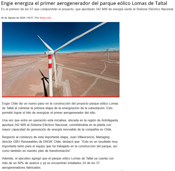 El parque eólico Lomas de Taltal energiza su primer aerogenerador y suma 80% de avance - (El Mercurio de Antofagasta)