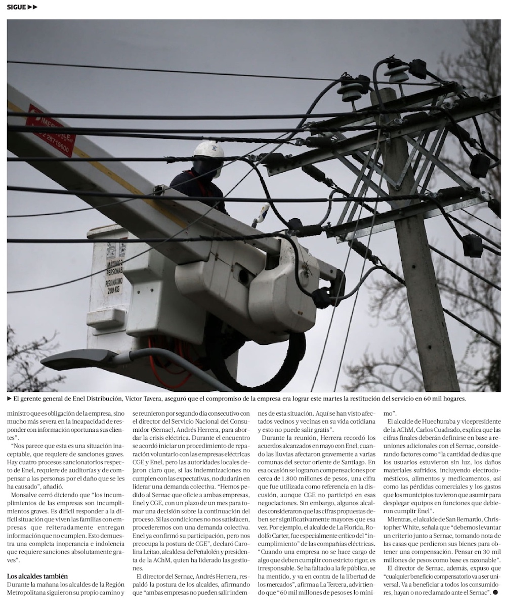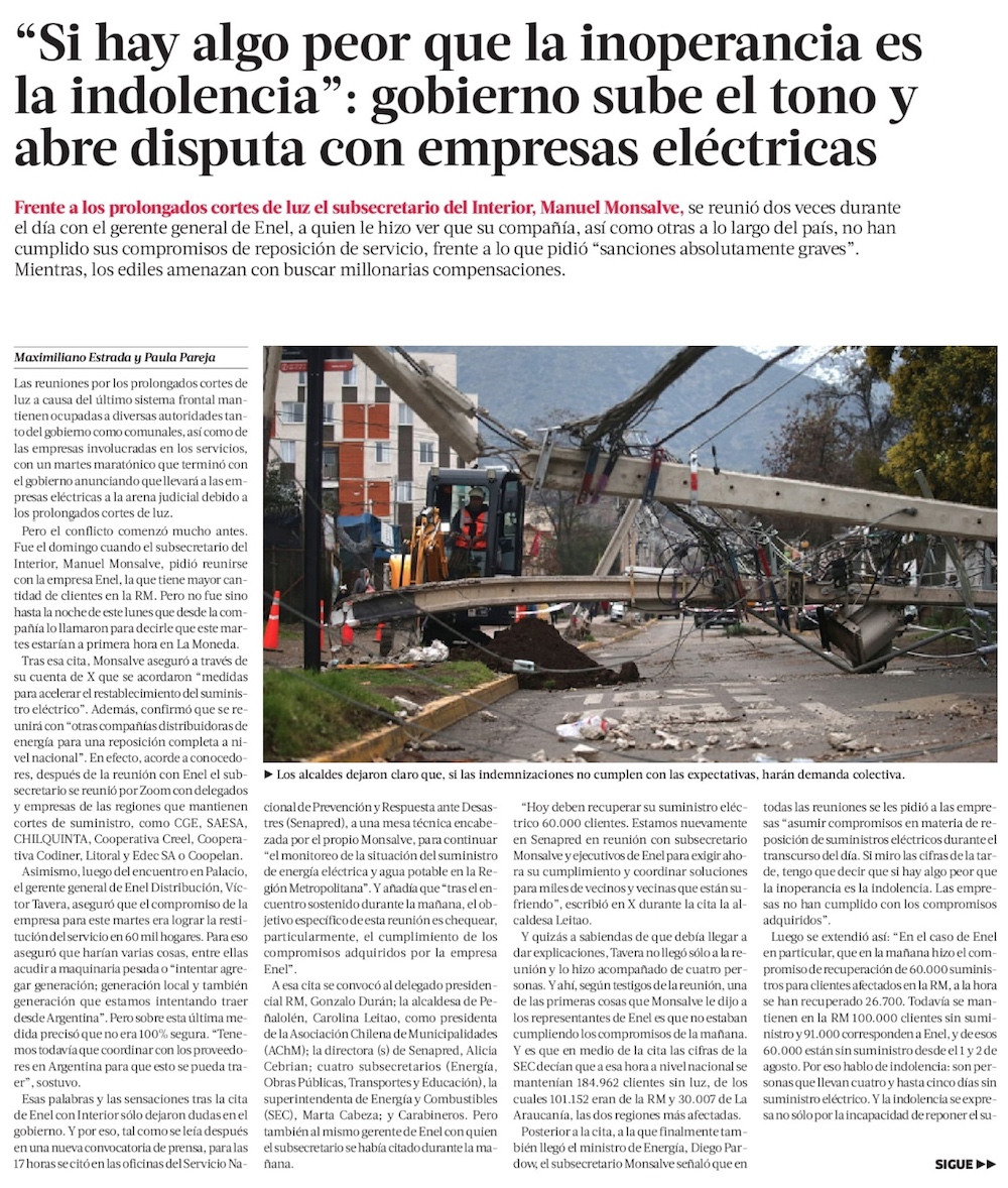Autoridad pone foco en la crisis y luego verá concesión de Enel Distribución - (El Mercurio de Santiago)