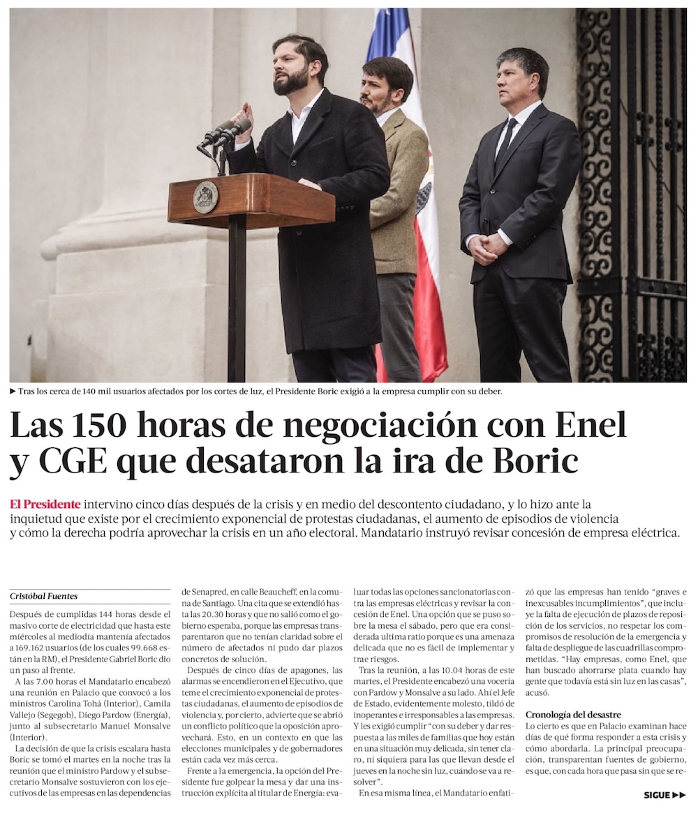 Boric apunta a revocar concesión de Enel, pero expertos eléctricos advierten dificultades prácticas de esta inédita medida - (El Mercurio de Santiago)
