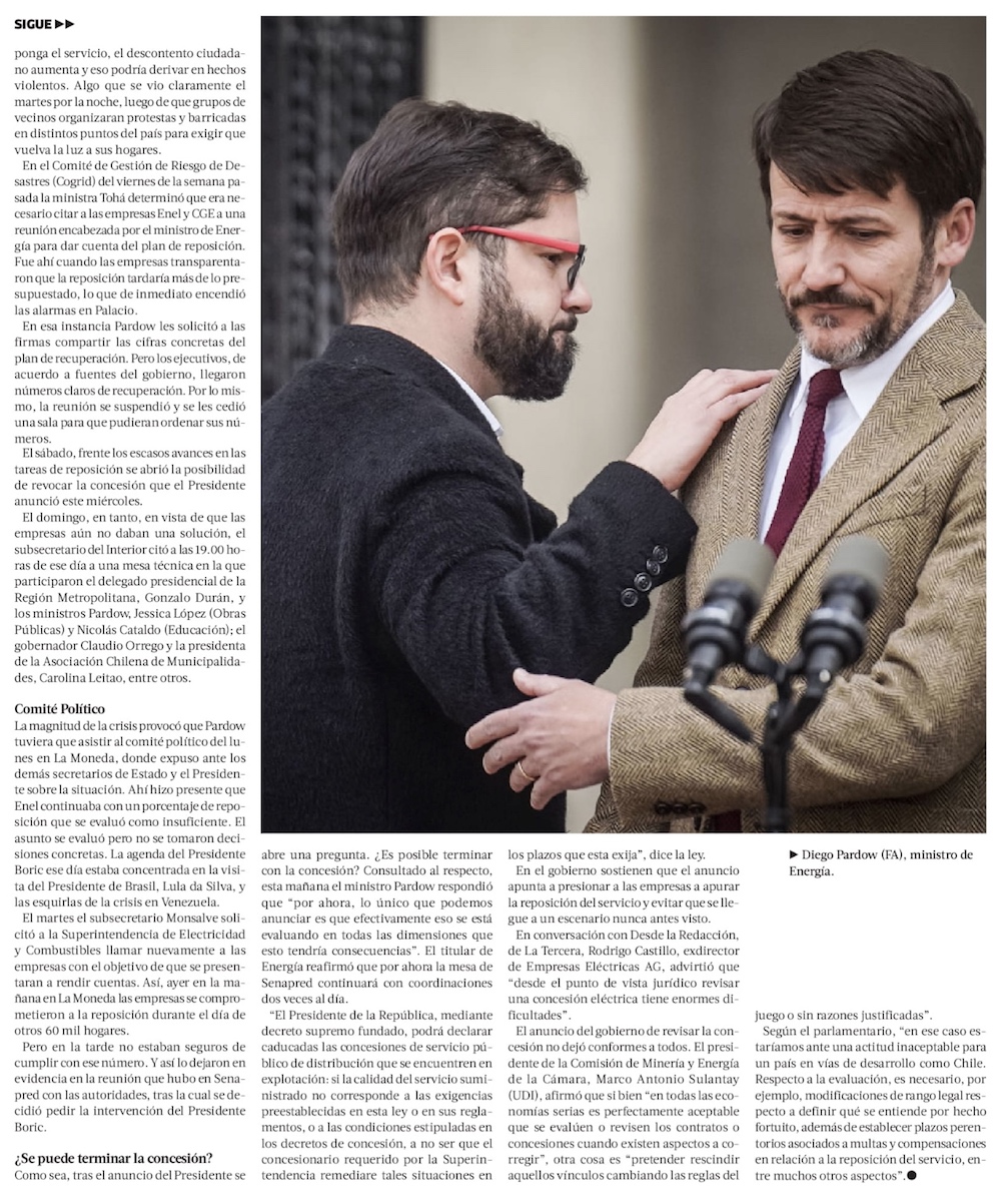 Boric apunta a revocar concesión de Enel, pero expertos eléctricos advierten dificultades prácticas de esta inédita medida - (El Mercurio de Santiago)
