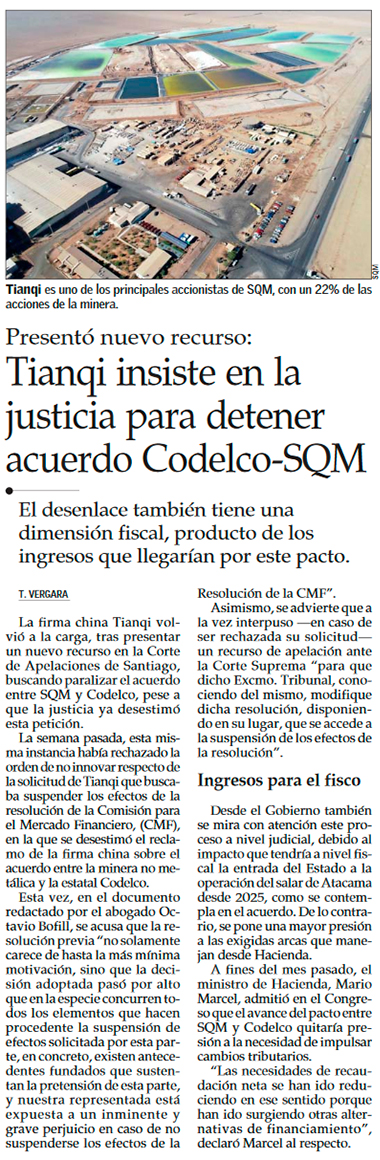Tianqi insiste: vuelve a pedir la suspensión del acuerdo Codelco-SQM y ahora apunta a la Suprema - (Pulso)