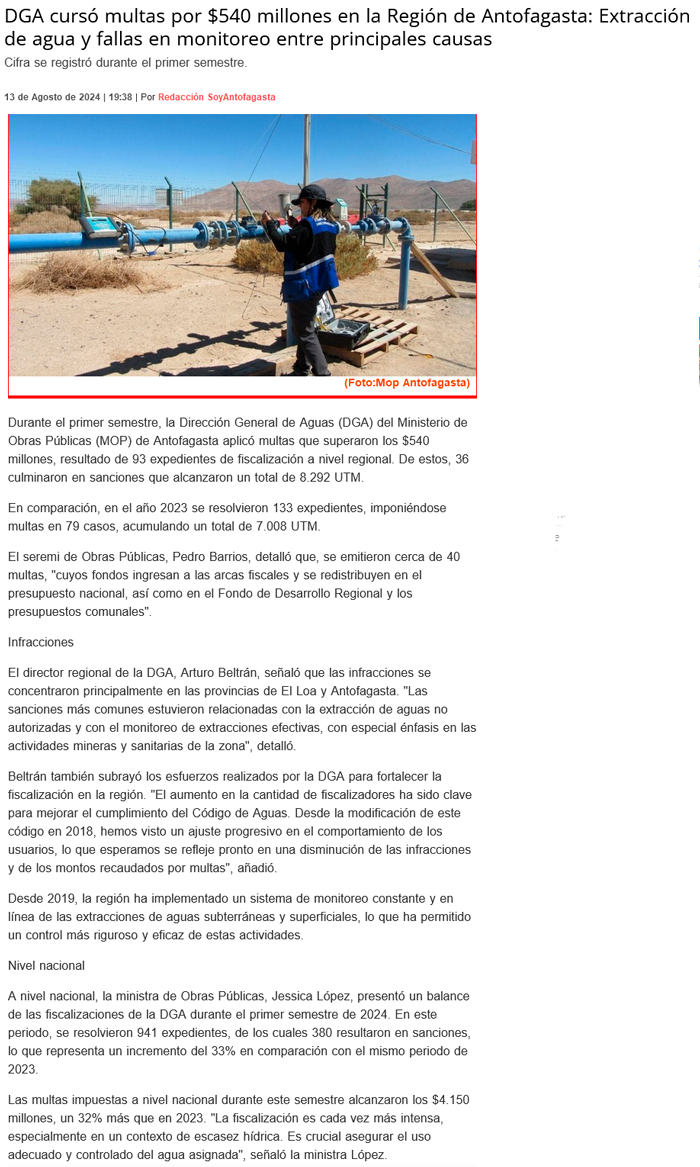 En lo que va del presente año la DGA ha cursado multas por $540 millones - (El Mercurio de Calama)