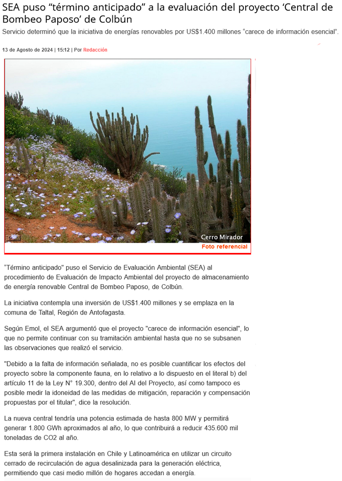 Central Paposo, de Colbún: SEA pone término anticipado a proyecto por US$ 1.400 millones - (El Mercurio de Santiago)