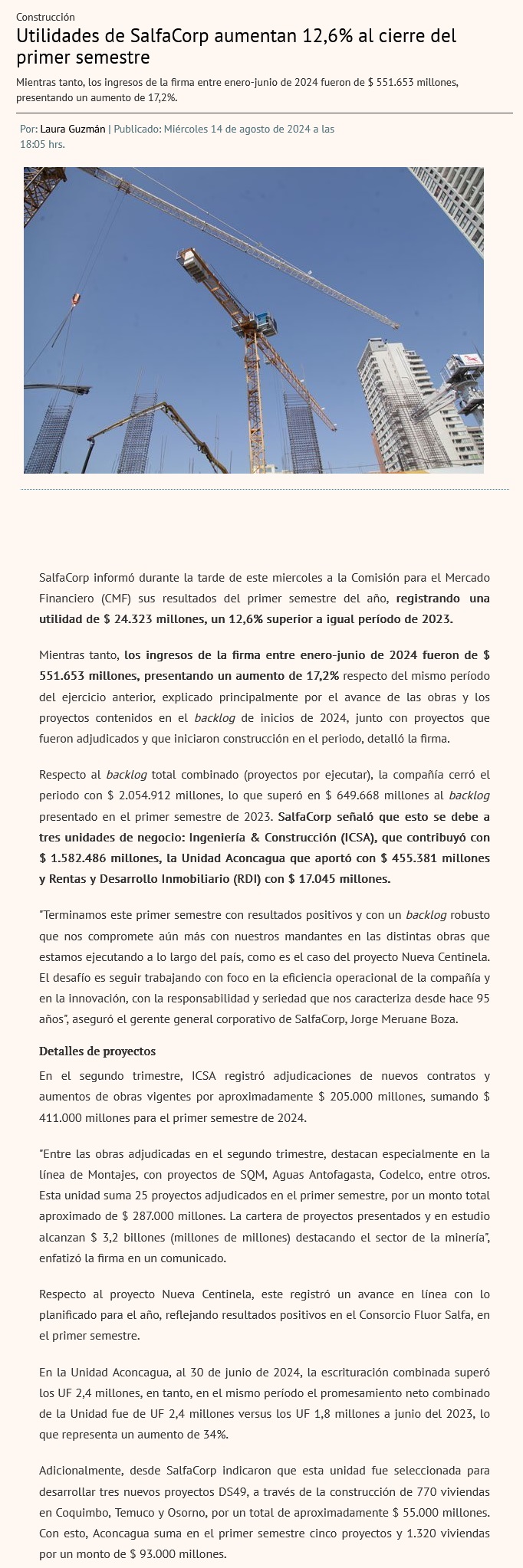 Salfacorp registra alza en sus ganancias semestrales ante avance de proyectos - (La Tercera Online)