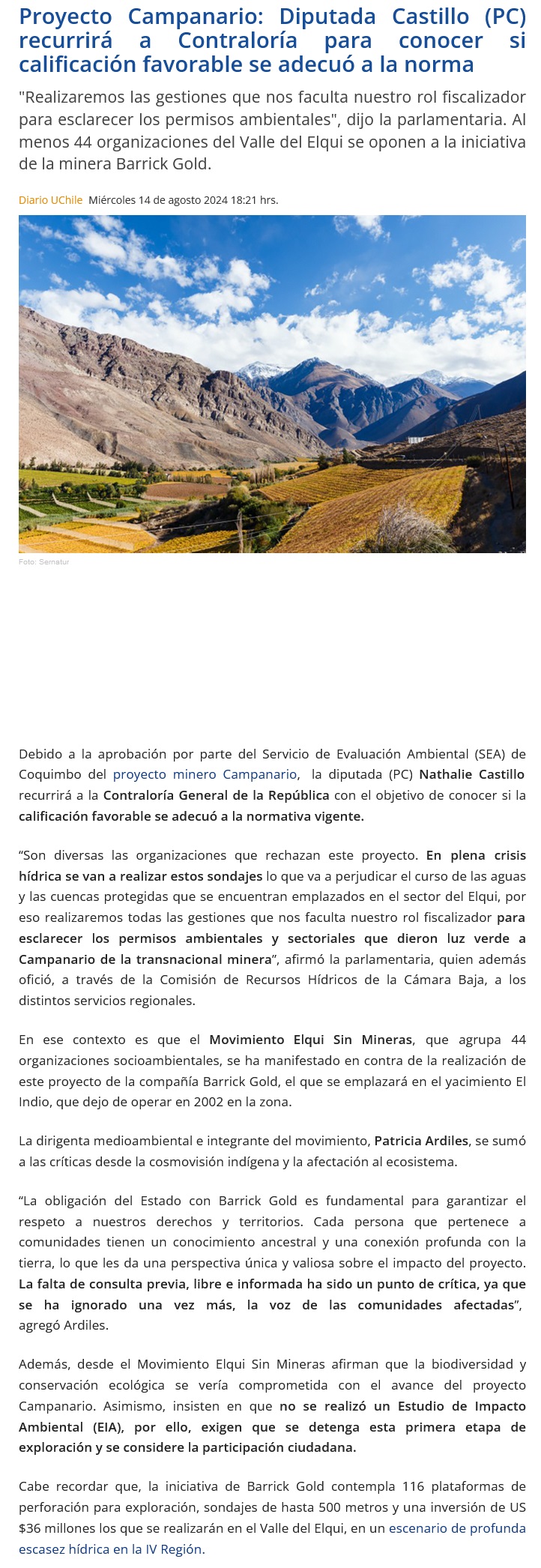 Recurrirán contra autorización a proyecto minero Campanario - (La Región)