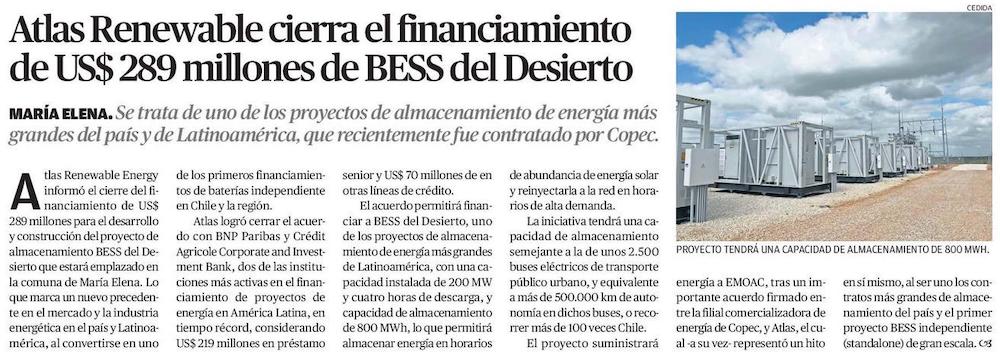 Atlas Renewable cierra financiamiento para su primer sistema de almacenamiento de energía en Chile - (Pulso)