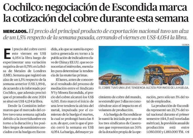 Cochilco: negociación de Escondida marca la cotización del cobre durante esta semana - (El Mercurio de Antofagasta)