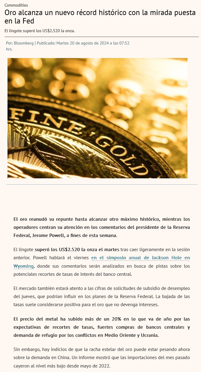 El oro alcanza récord y el valor del lingote del metal por primera vez supera el millón de dólares - (El Mercurio de Santiago)