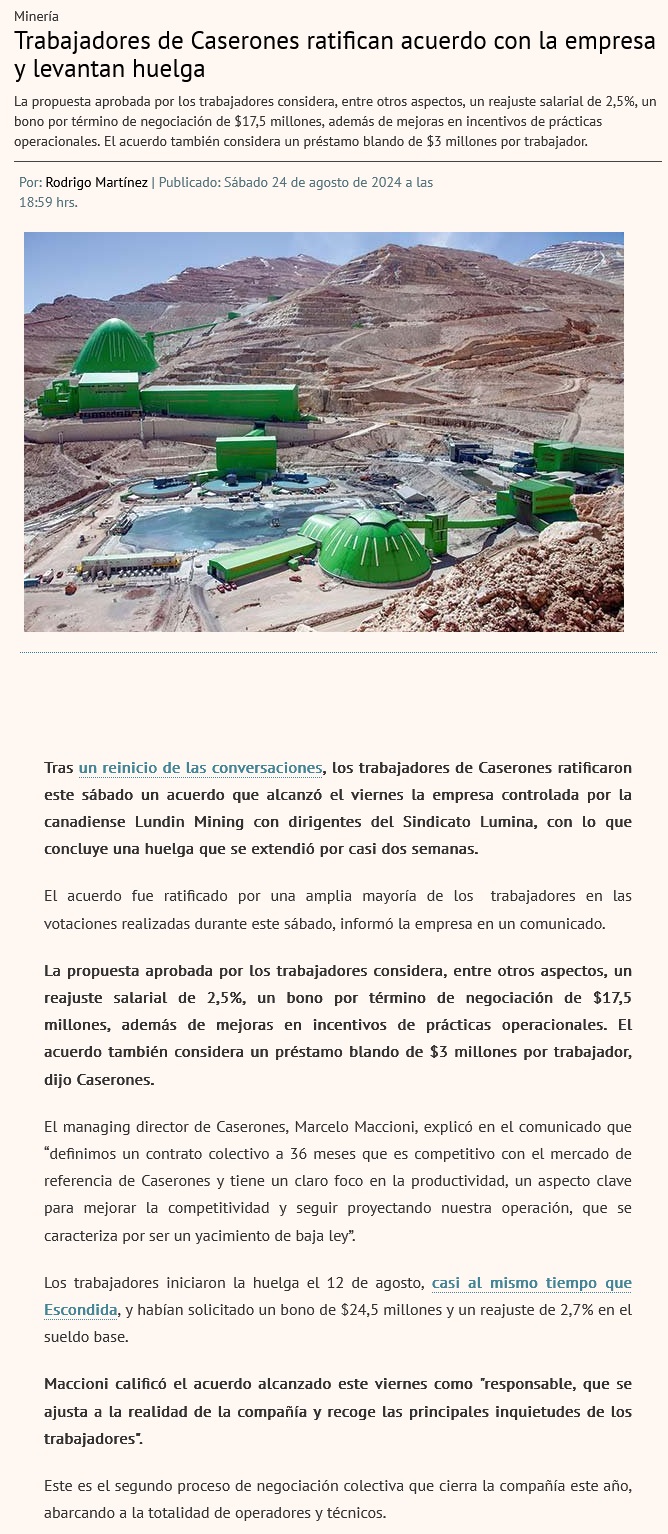 Termina huelga en Caserones: acuerdo incluye bono y préstamo 'blando' por 20,5 millones por trabajador - (soycopiapo)