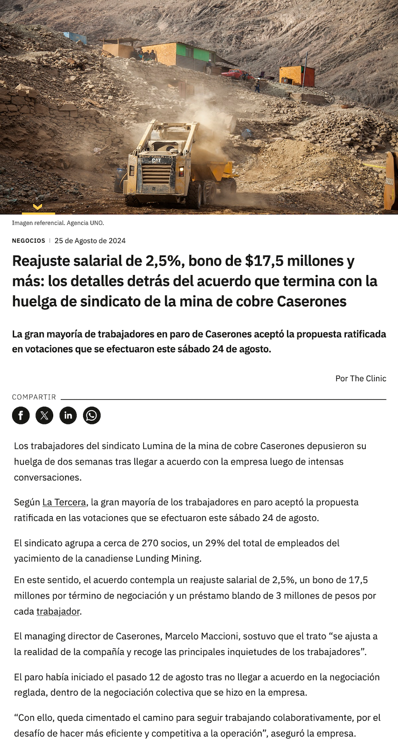 Finaliza huelga en mina Caserones: empresa acuerda con sindicato bono por término de negociación de $17,5 millones - (La Tercera Online)