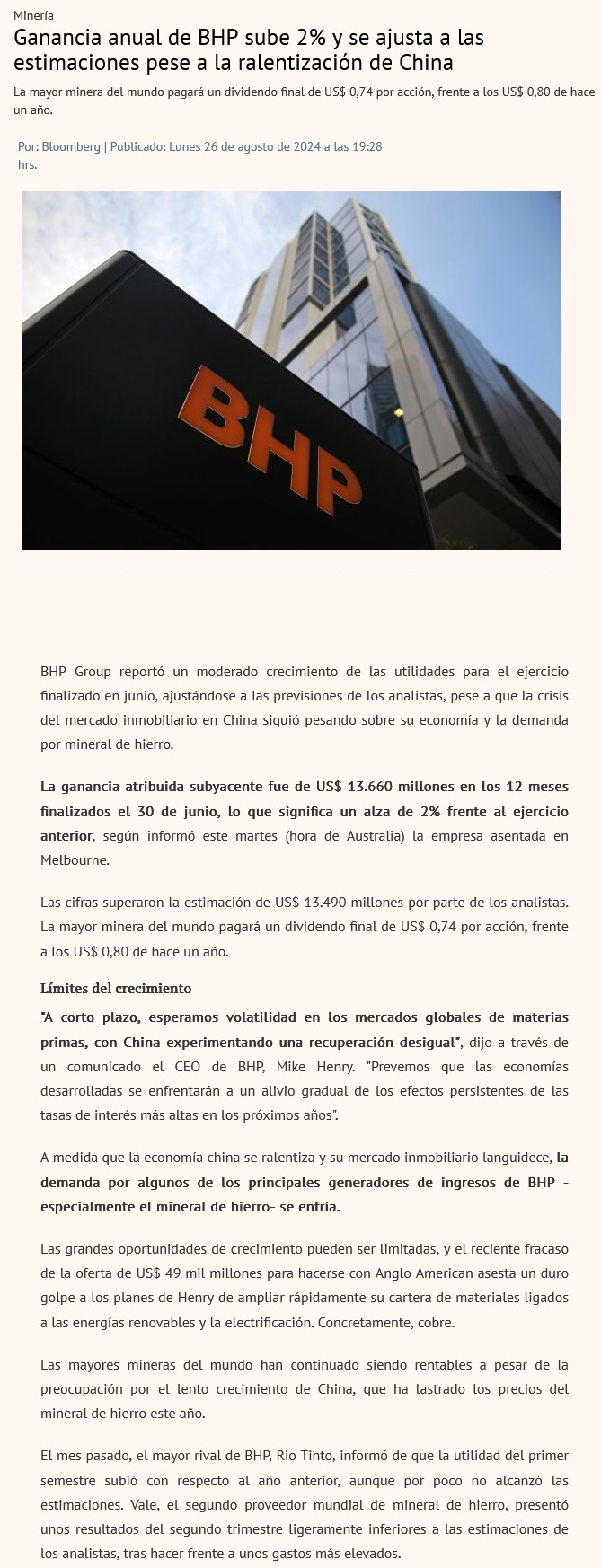 Beneficios de la australiana BHP suben 2% al cierre del año fiscal 2024 - (El Mercurio de Santiago)