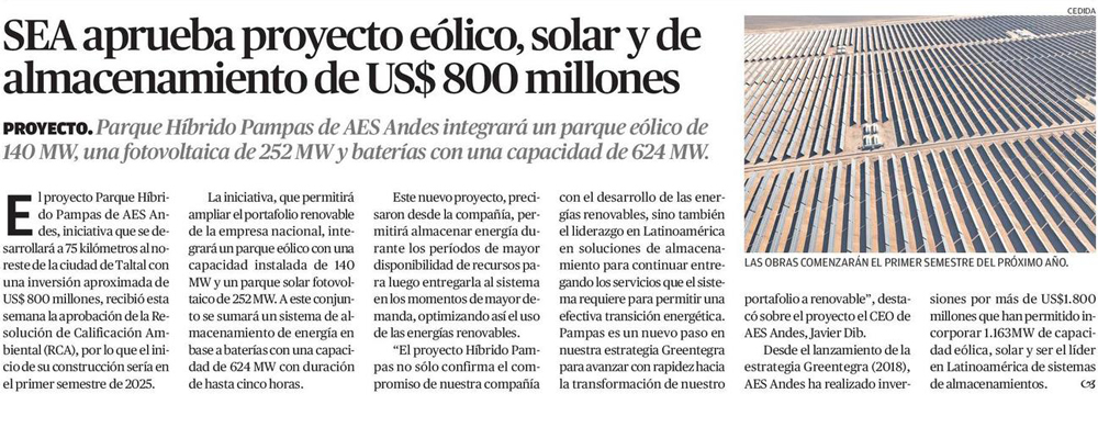 AES Andes recibe aprobación para parque eólico y fotovoltaico Pampas por US$ 800 millones - (Diario Financiero)