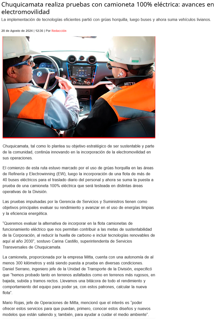 Electromovilidad: Codelco pone a prueba camioneta 100% eléctrica - (El Mercurio de Antofagasta)