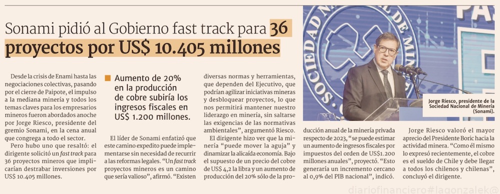 Sonami propone acelerar tramitación ambiental de 36 proyectos mineros - (El Mercurio de Santiago)
