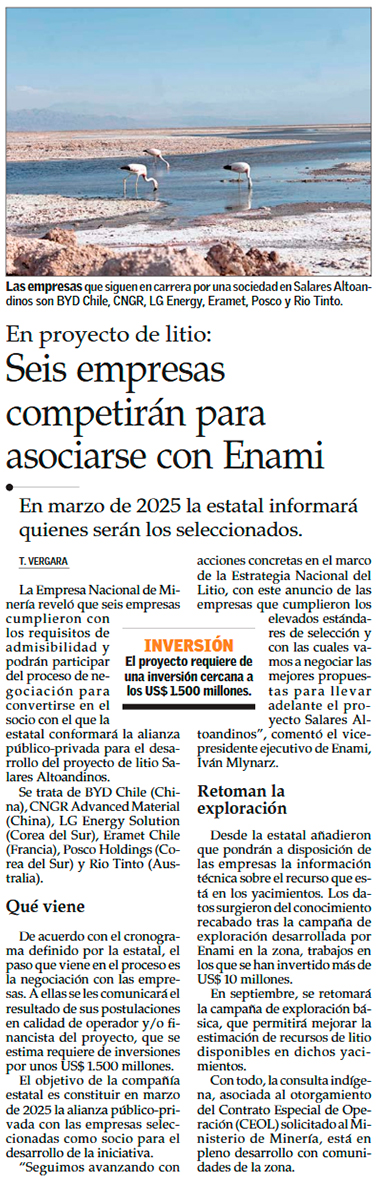 Enami preselecciona a seis empresas internacionales para su proyecto de litio Salares Altoandinos - (Diario Financiero)